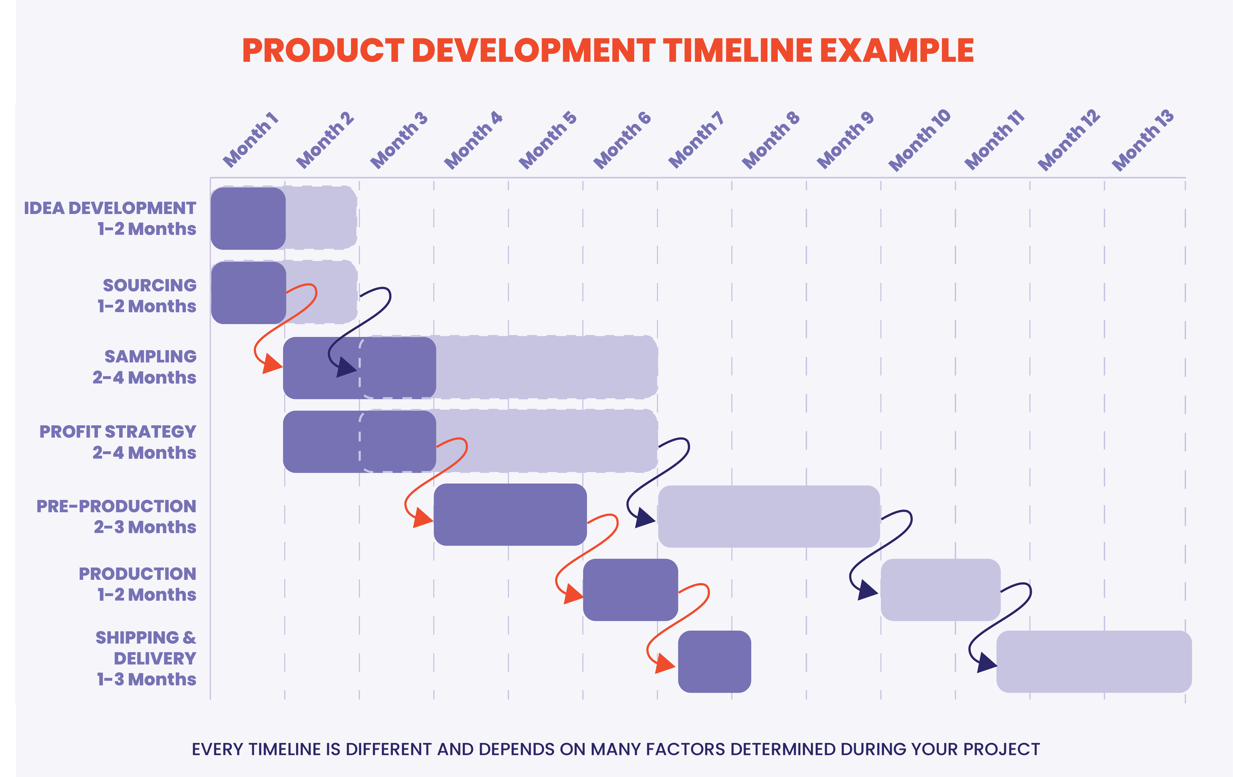 Building your brand’s timeline depends on many factors, some of which are not able to be determined until we begin the project - however, below is a typical timeline for our custom development projects. While each brand’s timeline can vary, here’s a general overview of the key stages involved in developing a product: